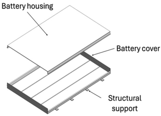 The battery pack is in the battery compartment, a space within the vehicle that must be designed to support the battery modules without compromising their functionality over time and if subjected to accidents [6]. In fact, the location of the battery pack within the vehicle can significantly affect dynamic performance. To optimize this, the battery pack should be positioned as close to the ground as possible to reduce the vehicle’s center of gravity. Proper positioning is also critical for vehicle packaging and occupant ergonomics [6]. The battery housing is typically situated beneath the passenger compartment floor to mitigate these potential adverse effects. This configuration enhances battery protection during a side impact and facilitates easier servicing and maintenance. In the new battery electric vehicle (BEV) design, integrating the battery pack’s housing with the vehicle floor creates a sandwich structure, which can improve the vehicle body’s overall stiffness (both torsional and bending) and enhance the acoustic insulation of the passenger compartment. The compartment is often fortified with additional safety systems such as structural reinforcements or fireproofing materials [7]. The battery cells should be kept within the optimal temperature range of 25 °C to 35 °C either by heating or cooling. This is vital for minimizing aging effects and extending the battery’s operational lifespan [6].