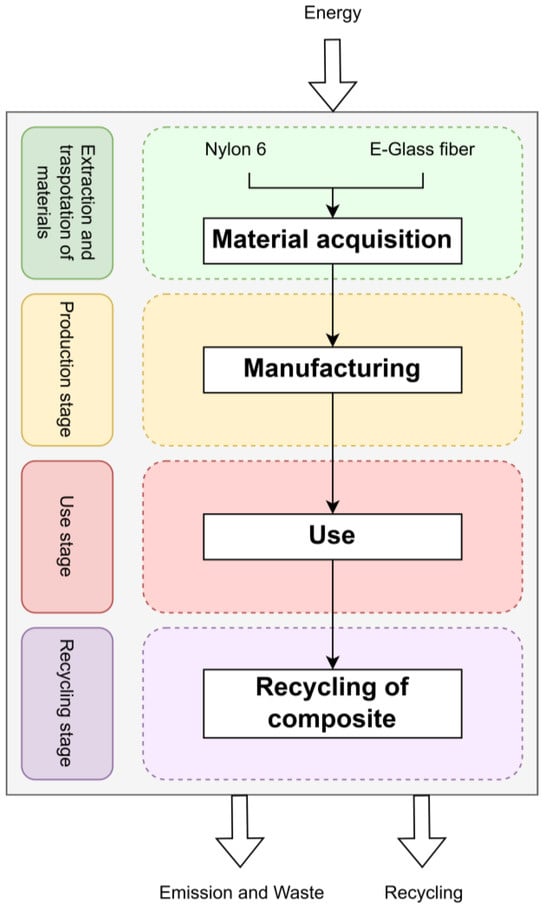 - Raw material extraction and transportation: resource extraction for glass fibers and thermoplastics.