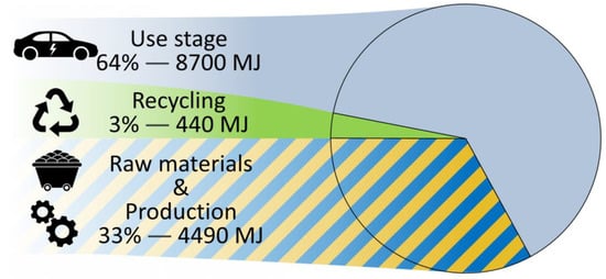 By Lunetto et al. [21], the mechanical recycling of fiberglass composites has a specific energy consumption ranging from 0.4 to 5 MJ/kg. An important hypothesis is that the whole battery enclosure will be recycled. In the absence of direct data on the specific consumption for a glass/PA6 composite, the worst-case scenario was assumed. For a functional unit, the mass amount is 87.55 kg; thus, the associated energy consumption for this process can be calculated according to the product of mass for the upper bound of specific energy consumption (SEC) for mechanical recycling (437.75 MJ).