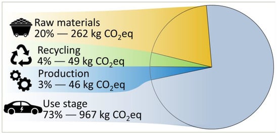 As outlined in the previous sections, it is possible to calculate the energy requirements and CO2 emissions for each phase of the battery enclosure’s life cycle, including the usage and recycling stages. For the usage phase, CED results in 2418 kWh (8704 MJ), while the recycling phase for the entire battery pack demands 437.75 MJ. Thus, the total CED amounts to 13,629.9 MJ. To calculate the kg of CO2 equivalents generated by energy consumption, the electricity consumption for use and recycling phases is considered, referencing the European Union average value of 0.4 kg CO2/kWh [26].