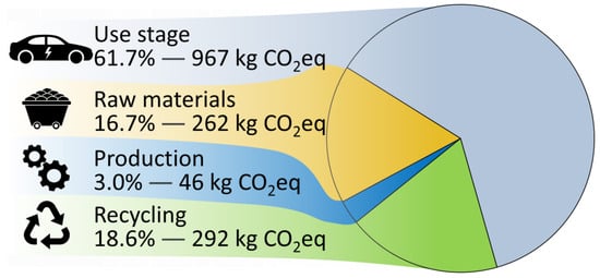 For this study, the following assumptions have been made: the battery pack’s lifespan is projected to be 8 years, with a total average distance of 300,000 km covered throughout its entire life cycle. Additionally, assembly stages are not considered because they are supposed to be negligible compared to the main production stage, and the battery enclosure is completely recycled.