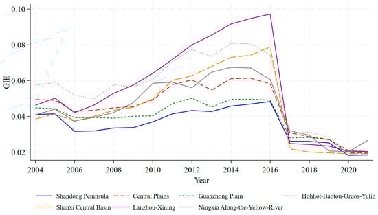 The results of the green innovation efficiency calculations are illustrated in Figure 2. It can be seen that, contrary to expectations, the GIE of the Lanzhou-Xining urban agglomeration (UA) in the western region surpasses that of the Shandong Peninsula urban agglomeration in the east. This phenomenon suggests that, after prolonged competition, industries in the eastern region have already reached the technological frontier, making further improvements in green innovation efficiency increasingly difficult. Consequently, many firms opt for relocation to maximize profits. In contrast, the Lanzhou-Xining UA in the west, characterized by lower levels of innovation investment and technological development, exhibits higher marginal returns to innovation, resulting in relatively high green innovation efficiency. However, its weak innovation foundation also leads to instability in green innovation outcomes. Before 2016, overall GIE exhibited an upward trend. However, in 2016, there was a sharp decline, which may be attributed to the implementation of supply-side structural reforms at the end of 2015. The key policy measures—cutting excess industrial capacity, reducing inventory, deleveraging, lowering costs, and addressing weaknesses—led to the large-scale shutdown of high-pollution industries. This, in turn, reduced R&D budgets and diminished the number of key green innovation entities, thereby weakening the momentum for green innovation.