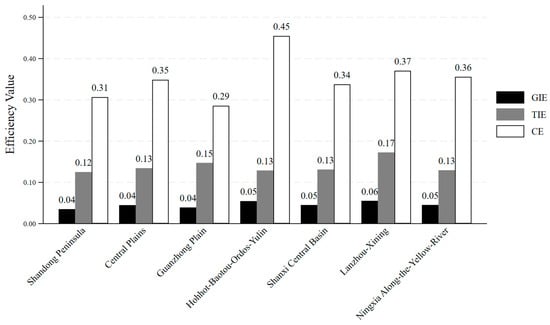 Figure 3 presents the overall GIE, TIE, and CE across different urban agglomerations. The results indicate that efficiency is highest in the commercialization stage, followed by the technological stage, while overall efficiency is the lowest. This suggests an imbalance in the development of GIE in the Yellow River Basin, with insufficient emphasis on technological R&D, which may be a fundamental cause of the overall low efficiency in green innovation.