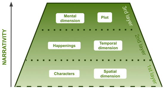 The first layer of narrative thinking concerns “world-making”. There are different interpretations of what that means [30]; in our case, it involves establishing and describing “what”, “where”, and “how” things work. This provides a coherent description of a world in a specific state when events unfold in a “predictable” manner. As Bruner suggests, both science and literature can be seen as forms of “world-making” [8,9]. While the bottom layer of paradigmatic artefacts is concerned with investigating and describing time-invariant laws of nature, at this layer they are concerned with describing the place-specific implications of those laws and/or time-specific natural/societal states of the organisation (habits) of that specific place. The same applies to narrative worlds, with the difference that, in such contexts, data and mathematical logic can be twisted (creating fictional or fantasy worlds), as long as the world maintains what Bruner calls “canonicality in human interaction”. In line with this, three typical narrative elements characterise this level: