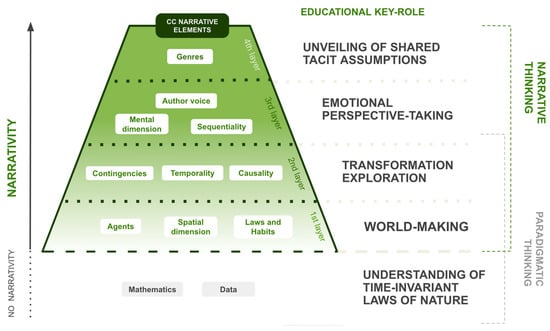 This study has been especially informed by the literary concept of “narrativity”, employed to build a framework that unpacks the complexity of CC narrative features in four hierarchical but interconnected layers, and clarifies their positioning in regard to a paradigmatic/narrative thinking spectrum. The framework has been adapted as a tool with the aim of informing the design of narrative-thinking-enhanced CC courses and the selection of those narrative artefacts that best address CC’s specific educational challenges.