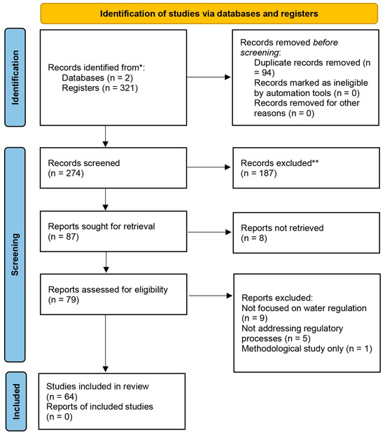 Studies were excluded if they did not meet the inclusion criteria. Specifically, we excluded studies that (1) lacked a focus on socio-environmental regulation or water resources management in watersheds, (2) did not address regulatory processes or governance aspects, (3) were outside the social sciences discipline, or (4) were non-original publications, such as reviews, editorials, or commentaries. These criteria ensured that only studies relevant to the operational deployment of socio-environmental regulation were included, aligning with the review’s focus. Full-text reviews were conducted for potentially relevant articles. Discrepancies between the two independent reviewers were resolved through discussion, and, when necessary, by consulting a third reviewer. The PRISMA flow chart (Figure 1) illustrates the review process, starting with 321 initial articles and resulting in the final selection of 64 studies for analysis.