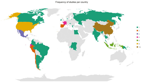 The study systematically reviewed 64 articles (Figure 2 and Figure 3), selected according to predefined inclusion criteria. Of these, 28 were published in East and Southeast Asia (China, Indonesia, Sri Lanka, Thailand, India, and Papua New Guinea), 12 in South America (Ecuador, Peru, Colombia, Chile, Brazil, Argentina, and Uruguay), 11 in Western and Central Europe (France, Portugal, Spain, Ireland, Croatia, Greece, Denmark, and Russia), 11 in North America (the United States, Canada, and Mexico), and 2 in Africa (the Democratic Republic of Congo and Egypt).