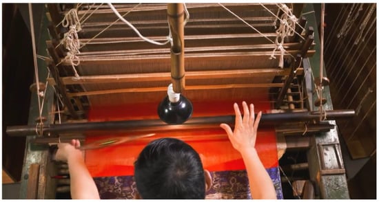 National ICH inheritor He Bin is demonstrating Shu brocade weaving techniques (from the Guardians of Cultural Heritage program, co-produced by China Soong Ching Ling Foundation and Baidu, 2018; refer to https://baike.baidu.com/item/%E8%9C%80%E9%94%A6%E7%BB%87%E9%80%A0%E6%8A%80%E8%89%BA/8087818, accessed on 17 December 2024).