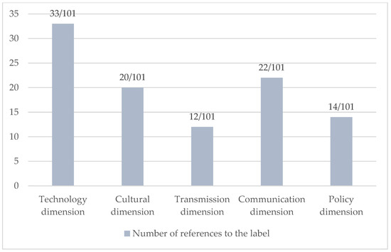 Out of 101 initial labels in this study, 33 belonged to the technology dimension, 22 to the communication dimension, 20 to the cultural dimension, 14 to the policy dimension, and 12 to the transmission dimension. The result shows the great importance of cultural connotation in the digital dissemination process of traditional techniques of ICH, which includes cultural, communication, and transmission dimensions, as shown in Figure 3.