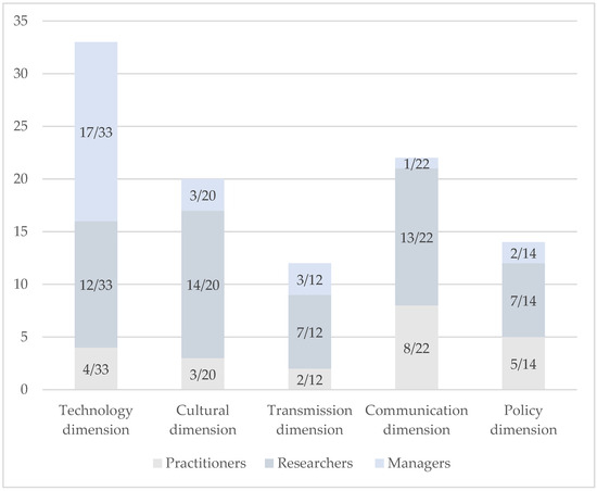 In this research, the interviewed stakeholders were categorized into three types: managers, researchers, and practitioners. Different types of respondents had different perceptions on the indicators affecting the effectiveness of digital dissemination of traditional techniques, as shown in Figure 4. Managers (the government) gave the most attention to the technology dimension while neglecting the role of communication. This is due to the highly centralized government that is closely related to the national policy and social trend of building a strong science and technology country and responding to the development of the Internet in China [34].