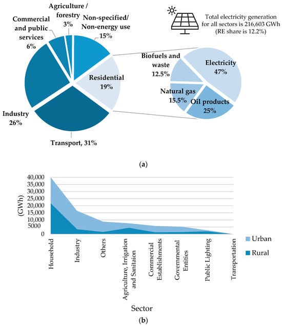The building sector is responsible for 5%, and the electricity and heat sector is responsible for 32% of the total GHG emissions [54]. The total final energy consumption is 2,582,513 terajoules in 2022 from different energy sources; behind the transportation and industry sectors, the residential consumption came in third place, at 20%, that is, electricity representing one-half of energy sources among oil products, natural gas, and biofuel and waste, as visualized in Figure 2a. The distributed electricity in 2020 accounted for 122,443 GWh (30% for rural areas), divided into eight sectors; the uppermost consumer sector is the household with 61,542 GWh (36% in rural areas), and the total share of RE in electricity generation is 12%, as depicted in Figure 2b.