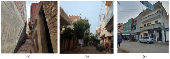 Lasaifr Albalad is located between 31.18° N and 30.72° E, with an elevation map of 6 m. It is a typical rural agriculture-based village, representing the region’s villages, following the Konaieset Alsaradoosy local unit in Desouq District, Kafr El-Shiekh governorate. According to our survey, the population was nearly 14,000 in 2021, and in 2006, the population was 8589 inhabitants [69], which increased by about 40% in 15 years. The inhabited area inside the urban boundary is about 0.35 km2. The settlement encompasses the urban fabric typical of villages in the Delta region (scattered, compacted, and some linear). The local road network includes four width gradients, mostly from 8, 6, 4, and 2 m; we notice that that the width of some roads varies, as per the unclear borders. It has few public and many private in-between spaces (e.g., backyards and gardens).