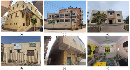 Non-residential building examples in the Lasaifar Albalad rural village (images’ source and credit: Ahmed Abouaiana): (a) the grand mosque; (b) a school building; (c) the health unit; (d) the agriculture association; (e) the social development building; (f) a residential-building structure performs the social activities of an NGO.
