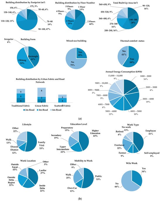 A total of 37 responses were collected. After excluding the invalid inputs, two respondents were not residents of the village, and three did not report energy consumption; 32 eligible replies remained. Analyzing the data collected (Supplementary Materials S1 and S2), the sample represents 83 families, with a total of 458 individuals. Figure 5a illustrates the attributes of buildings and urban settings. Figure 5b illustrates the socio-economic activity attributes of the households.