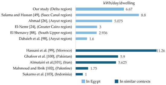 Nafeaa et al. [46] evaluated the influence of residential building morphology in urban areas in Egypt, utilizing simulation tools to quantify domestic consumption, either within their experiment or, as they reported, another study in a similar context that indicated a similar rate, as they highlighted the consumption affected by many factors like building systems, appliances, and behavior aspects. While Attia et al. [47] model the correlation between the building typology and domestic electricity consumption in different climatic zones, they do not explicitly state whether the correlation is urban or rural.