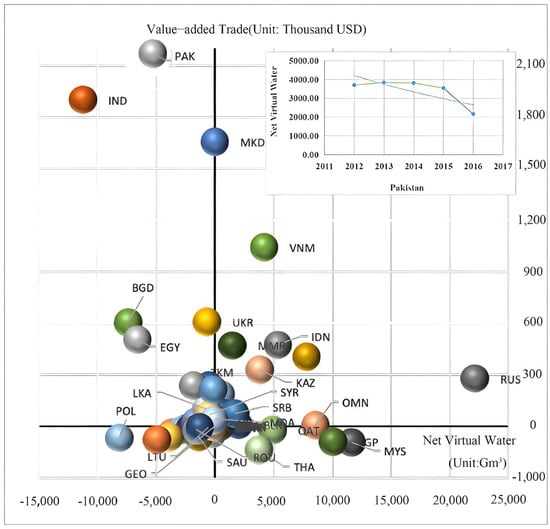 Nineteen countries are located in the third quadrant, which import virtual water trade, trade value added is negative, and they may face some pressure in trade. These countries include Afghanistan, Albania, and Azerbaijan. As an agriculture-oriented country, Afghanistan has been affected by war for a long time, with low agricultural production efficiency and unreasonable use of water resources, which leads to the need for a large number of imports in virtual water trade. Moreover, due to the single industrial structure and insufficient trade competitiveness, trade value added is negative. Countries such as Albania and Azerbaijan, with a relatively weak industrial base and a low position in the global industrial chain, lack advantages in virtual-water-related agricultural trade, while other trade areas have not achieved good value added, facing trade pressure. Meanwhile, the remaining 21 countries, including Pakistan and Nepal, occupy the fourth quadrant, where they engage in trade with China to derive economic benefits from their environmental resources.