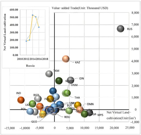 Figure 2 presents the trade and virtual land transfer patterns, which are essential for understanding the resource transfer in food trade. By visualizing the flow of virtual land resources, the figure shows the differences in food import and export volumes in terms of arable land consumption between China and Belt and Road countries, offering insights into the food trade structure from the perspective of land resources. With the exception of Oman, the remaining 13 countries in first quadrant overlap in their positions regarding virtual water trade. It is worth noting that, under the mechanism of the Belt and Road Initiative, Russia has increasingly cooperated with China and in the field of agriculture, and its virtual grain exports to China peaked in 2014 and were much higher than the exports of other countries during the same period. In the second quadrant are seven countries, including Singapore and Qatar. Additionally, 15 countries, including Kuwait and Israel, are situated in the third quadrant, which consists of water-scarce nations in West Asia and Central and Eastern Europe. Quadrant IV includes Afghanistan, Bangladesh, and 26 other countries. At the regional level, due to the advantages of climate and geographical conditions, countries in Southeast Asia have strong competitiveness in the production of tropical agricultural products. In the virtual grain trade with China, they mainly export tropical fruits, rubber, and other agricultural products and are in a trade surplus. Although some countries in Eastern Europe have a certain scale in agricultural production, due to the changes in domestic market demand and the adjustment of agricultural trade policies with China, the virtual grain trade with China shows a fluctuating state, and the trade deficit is unstable.