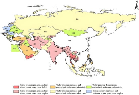 A distinct category includes 11 countries, such as Afghanistan, India, and Myanmar, which maintain stable water pressure while exporting virtual water to China. As depicted in Figure 3, the water resource pressure and virtual water trade relationship in China and Belt and Road partner countries can be clearly observed. The figure classifies countries based on net virtual water flows and water stress differences, vividly presenting the water stress changes in different countries during virtual water trade. This visual representation is crucial for analyzing the resource pressure transfer in trade and formulating corresponding strategies. The total net virtual water exports from these countries reached 5333.2 m3 in 2016, constituting 47.4% of China’s net virtual water imports, and their total volume is not to be underestimated. Predominantly developing countries, these nations possess sufficient water resources and can achieve resource complementarity and sustainable development within Belt and Road trade.