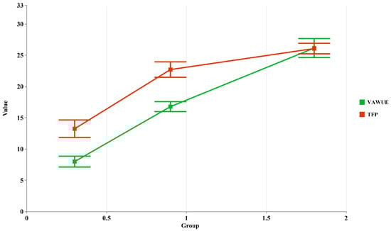 Figure 4 shows the comparison between virtual agricultural water use efficiency and total factor productivity of agricultural water use. According to the distribution trend of data points in the figure, VAWUE and TFP data points show an obvious positive correlation distribution trend, that is, when the VAWUE value is high, the TFP value is also high. When the VAWUE value is low, the TFP value is also low. This result proves the scientific value and reliability of the model in this paper. VAWUE can be regarded as “resource conversion efficiency”, virtual water and virtual grain represent the indirect input of water resources and land resources, respectively, in the trade context. TFP reflects the comprehensive utilization efficiency of all input factors in agricultural production, covering many factors such as technological progress and management level. In theory, both of them focus on the evaluation of agricultural production resource utilization efficiency, VAWUE focuses on virtual resource input and output, and TFP focuses on total factor input and output, which complement each other. In areas with abundant water resources and high utilization efficiency, the higher value of VAWUE usually means that the technology and management of water resource utilization are better, which will also promote the improvement of TFP. The data of the two are positively correlated, reflecting the scientific nature of model construction. The fitting effect of the two is good, indicating that, in different countries or regions, despite the differences in resource endowment, agricultural production technology, and economic development level, VAWUE and TFP show a stable positive correlation. The robust comparison results show that the model constructed in this paper can accurately reflect the internal relationship between virtual agricultural water use efficiency and total factor productivity under any kind of agricultural production environment. Even in the face of complex and changeable reality, the model results are still reliable, which further verifies the reliability of the model.