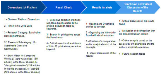 Figure 1 represents the methodology we followed to conduct this exploratory bibliographic analysis regarding the State of the Art about the three fundamental concepts presented. These concepts are interrelated and connected since a zero-waste city generates a quantum of disruptive innovation in the logic of planning, organization and management of the entire waste-value chain, its processes, infrastructures and multiple stakeholders. WebGIS is the conceptual basis supporting a digital government structure. Thus, for the proposed macroscale analysis methodology, we carried out an exploratory bibliographic review, searching for all types of publications that presented the words “zero waste”, “systemic innovation” and “webGIS” in exact correspondence in the study title, but in three different searches. As we intend to analyze the global application of the concepts, we chose to seek to aggregate scientific productions segregated by continents, especially with regard to publications on zero-waste strategies for cities. We established a range between 15 and 30 publications per keyword that make up the central axis of analysis for the article. The objective is to bring the State of the Art of scientific and legal productions as well as experience reports among other types of publications related to the proposed key words. We chose the Dimension (platform available on the website https://www.dimensions.ai, accessed on 15 September 2023) search platform because, with more than 1.8 billion publications, it is one of the most complete platforms today and it can be accessed by anyone. The part of the results presented as the beginning of the initial concepts of digital government, webGIS platform for managing zero-waste cities and circular economy, emerged from the author’s empirical work with the host city, who applied the concepts and logic of development based on the technology of webGIS platforms and digitization and digital transformation of public policies.