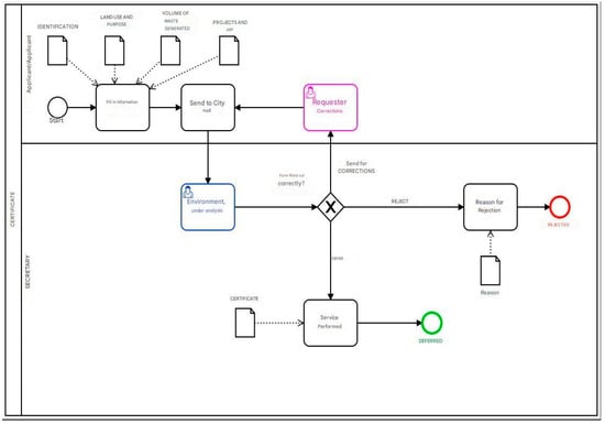 Figure 4 represents the digitalization of one of the public services in the city of Florianópolis, developed during a technical and scientific cooperation agreement with the author. The flow in question is a requirement from the city hall to begin collecting solid household waste in new units. A process, once analog, was completely digitalized to facilitate and give efficiency and effectiveness to this digital service that could be performed by any computer connected to the internet. The flow requires the delivery of the identification of the real estate unit, (linking the unit to the CTM Multipurpose Territorial Registry), the purpose of land use and occupation, the volume of waste generated by the unit, applicable projects and certificates of technical responsibility. After collection, the process is sent to an analyst from the city’s environmental department, who will check compliance and non-conformity, granting the request, sending it back for corrections and/or rejecting the request. The entire procedural process can be monitored by the applicant, analyst and manager of the responsible secretariat, forming one of the services that make up the IDE spatial data structure and digital government for zero-waste cities and a circular economy. It represents innovation and the digital transformation of the public sector linked to waste, or at least the beginning of this process.