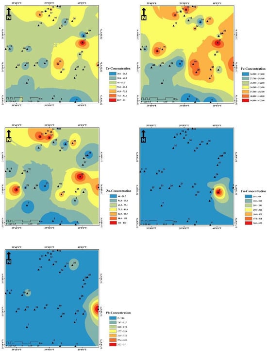 51]. The natural weathering of Proterozoic rocks, which raises the amounts of Cr and Fe, is one of the geogenic variables that PC1 captures. Because Pb and Zn are naturally enriched in the nearby bedrock, their existence in this component indicates a partial geogenic contribution. The impact of human activity on Cu concentrations is shown in PC2. The main causes of Cu pollution are industrial processes, agricultural uses, and the application of insecticides containing copper. The Cu separation into PC2 indicates that it comes from a different source than the geogenic metals in PC1. PC3 emphasizes the localized sources of lead, which might be caused by past or ongoing human actions, like the usage of lead-based products in certain places. The Pb separation into a distinct component is consistent with its poor association with other metals and emphasizes the significance of locating the sources of contamination locally [