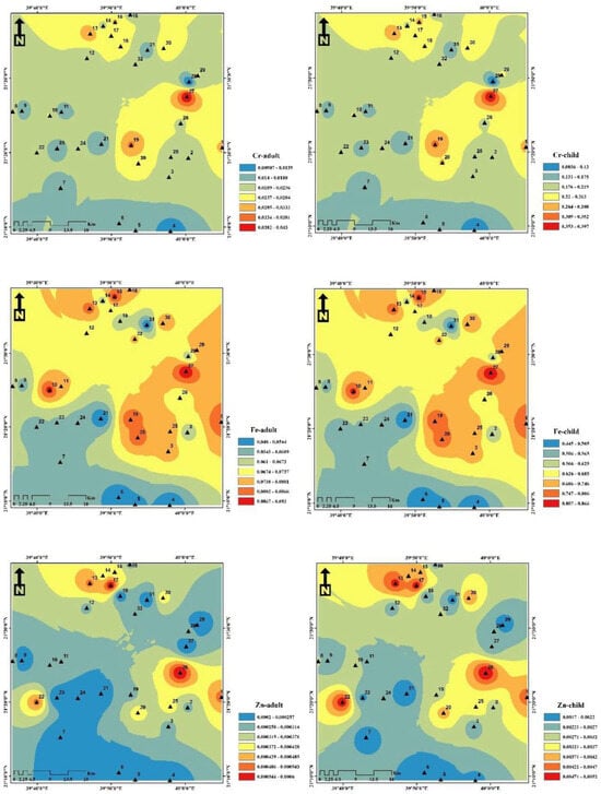 59]. While the HI values for all metals remained below the threshold of concern, the elevated HI and LCR values for Cr in children suggest a need for targeted interventions in specific hotspots [