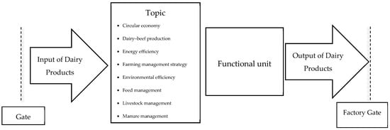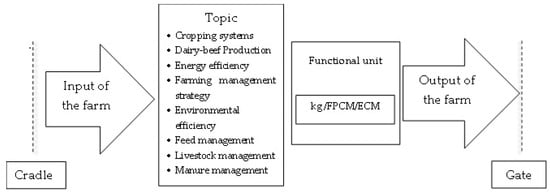 Schematic presentation of the studies in this review related to milk production, defining the system boundaries considered in this review [6].