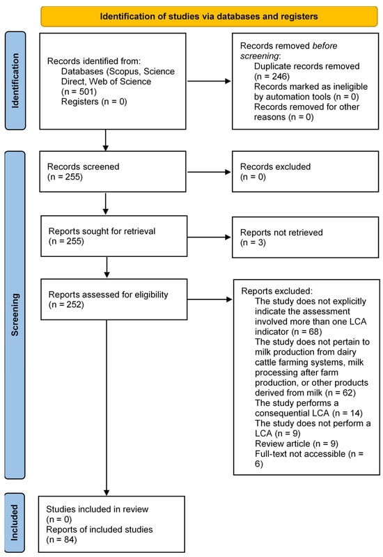 Figure 4 presents the decision process for the inclusion and exclusion of studies according to the PRISMA 2020 guidelines for reporting systematic reviews. The studies were evaluated using specific eligibility criteria to address the RQs. After identifying studies related to milk production from dairy cattle farming systems, milk processing after farm production, or other products derived from milk, eligible studies had to indicate that (i) an LCA was conducted, (ii) the impact assessment involved the calculation of more than one LCA indicator, and (iii) an attributional LCA approach was considered as the modeling principle for the study. We acknowledge that our review has limitations regarding the search period, selection of search databases, and language criteria.
