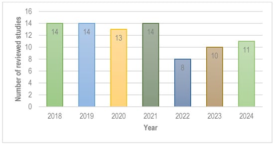 This research examined 84 papers released between 2018 and 2024. On average, there were 12 publications per year. As illustrated in Figure 5, a consistent trend in published studies reflects interest in the RQs raised in this review.