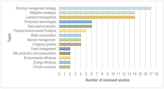 The most discussed topics in the reviewed studies include (i) farming management strategies, (ii) mitigation strategies, and (iii) livestock management. Circular economy, energy efficiency, environmental efficiency, milk production and consumption, and feed management have only been explored to a limited extent. Figure 6 visually categorizes all the emerging topics, indicating the number of studies within each category.