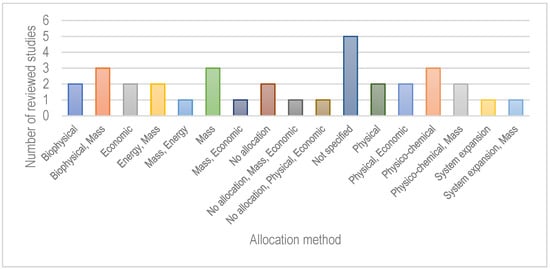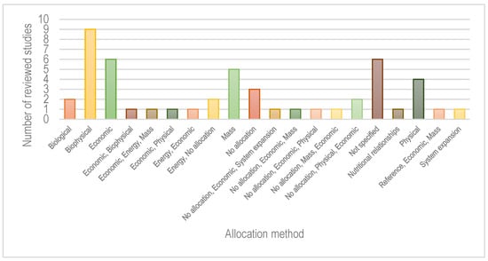 On dairy–beef production, an LCA compared the environmental performance of two dairy–beef systems: the non-integrated system, which only included dairy cow breeding, and the integrated system, which combined dairy breeding with maize silage planting [23]. Two cases were analyzed to evaluate the environmental impacts associated with the co-production of beef: a semi-confinement dairy farm and a pasture-based dairy farm [24]. Similarly, one study assessed the environmental footprint of dairy farms raising a dual-purpose cattle breed [25,26]. Considering five impact categories—global warming potential, eutrophication potential, acidification potential, resource depletion, and land use—a study assessed the environmental impacts of dairy production, specifically examining integrated dairy–beef systems and their effects on beef farms [27]. Another study combined LCA with data envelopment analysis (DEA) to create an eco-efficiency indicator that measures environmental burdens per unit of milk and dairy beef produced. Within the DEA framework, the weight of dairy beef relative to milk is gradually increased to assess the environmental impacts of prioritizing milk production [28].