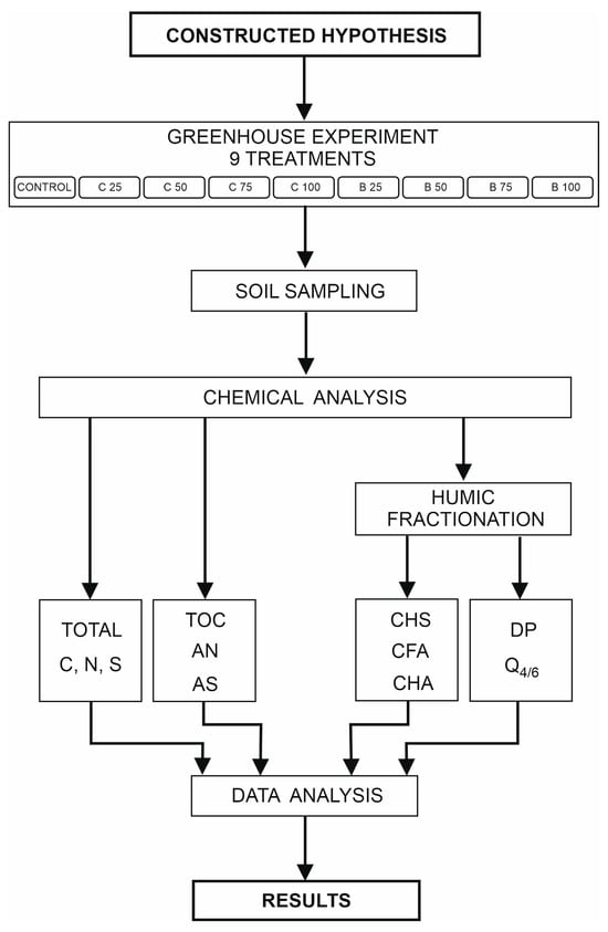 A greenhouse pot trial was conducted under controlled environment conditions using terra rossa (Rhodic Luvisol) [33] as an experimental soil and Chinese cabbage (Brassica rapa L. subsp. Pekinensis (Lour.) Hanelt.) as a test plant. Although the plants were used in the experiment, this research does not concern this aspect, focusing only on the soil and changes taking place there. Terra rossa prevails as a soil type in the Istrian region and contains a large fraction of kaolin clay with a small amount of vermiculite. The average clay content is 46.9%, 60.2%, and 75.9% for A, E, and Bt, respectively [34]. The soil samples used for the experiment were taken from the rhizosphere layer. After drying and sieving (2 mm), the soil was mixed in appropriate mass proportions with two organic amendments: compost from sewage sludge (CSS) and biochar from sewage sludge (BSS). Both compost and biochar were prepared using the same dewatered aerobically stabilized sewage sludge (SS) obtained from a local wastewater treatment plant. The SS was subjected to pyrolysis and composting to generate biochar and compost, respectively, which were used as organic amendments in this study. A detailed description of compost and biochar preparation was given by Černe et al. [35], and the necessary information is provided there. The initial mixture composed of SS and wheat straw (at a dose 40 kg of straw per 1 m3 of SS) was composted in the static pile and was completed after three months of the process. For the SS biochar, the Kon–Tiki system was employed [36].
