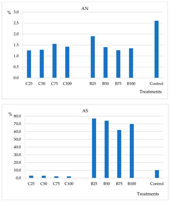 In turn, increasing doses of SSB significantly and clearly increased the amount of AS (from 407.88 to 1389.76 mg∙kg−1) compared to the level of the nutrient in the control soil (8.22 mg·kg−1). The SSC treatments resulted in 3–8-fold greater AS levels in the soil than the control treatment did; however, this difference was not statistically significant (Table 2). This effect was consistent with the percentage of AS in its total amount, which ranged from 2.1 to 3.0. A greater percentage of AS in the total sulfur amount was detected for the soil fertilized with SSB, and in the present study, as in the case of AN, with an increase in the SSB dose, the percentage decreased from 77% (B25) to 71% (B100) compared to 10% for AS in the control soil (Figure 2).
