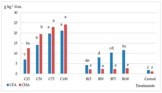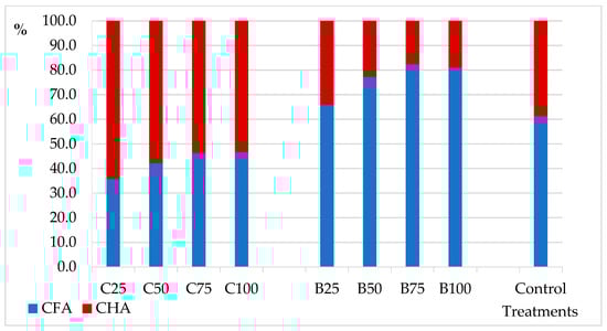 As indicated by the data in Figure 4, the percentage of CHA in CHS was dominant (53.3–64.3%) in the soil fertilized with SSC, while SSB contributed to a higher percentage of CFA in CHS (65.9–81.0%). It should be noted that, in both cases, with increasing doses of organic additives, there was an increase in the percentage of CFA and a decrease in the percentage of CHA.