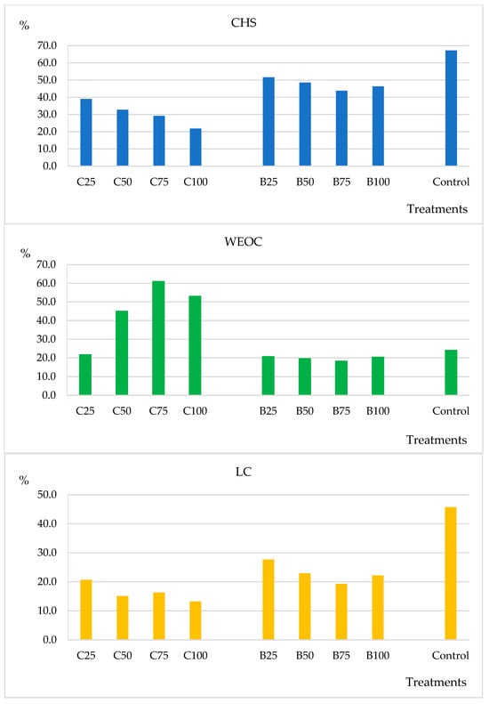 The percentage shares of CHS, WEOC, and LC in the TOC content are also interesting (Figure 5) because they clearly show the influence of the additives used. In contrast to the trend shown earlier (see Table 3), increasing doses of SSC and SSB resulted in a successive decrease in the percentage of CHS and LC in the TOC. The lowest percentages of LC were determined to range from 13.2 (C100) to 20.7% (C25) or from 19.3 (B75) to 27.7% (B25). The amendments used significantly reduced the share of LC in the TOC because, under control conditions, this form of C represented 45.8% of the TOC (Figure 5). The influence of SSB fertilization caused a higher percentage of CHS (43.9–51.6%) than SSC application (21.9–39.1%), which was still lower than that of the control (67.3%). The percentage of WEOC regardless of the SSB dose was at a comparable level (18.2–20.6%). However, higher SSC doses resulted in a higher percentage of WEOC (61% in the case of C75 and 53% in the case of C100). Generally, the percentage of WEOC (21.7–61.0%) was greatest in the soil fertilized with SSC. This was the opposite phenomenon to that of the control soil (24%) and the soil enriched with SSB (18.2–20.6%), where the lowest percentage shares of such soil C connections were recorded (Figure 5).