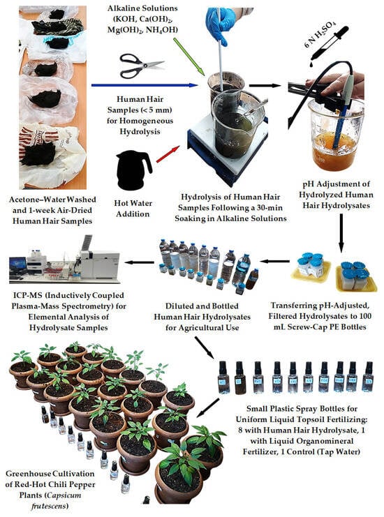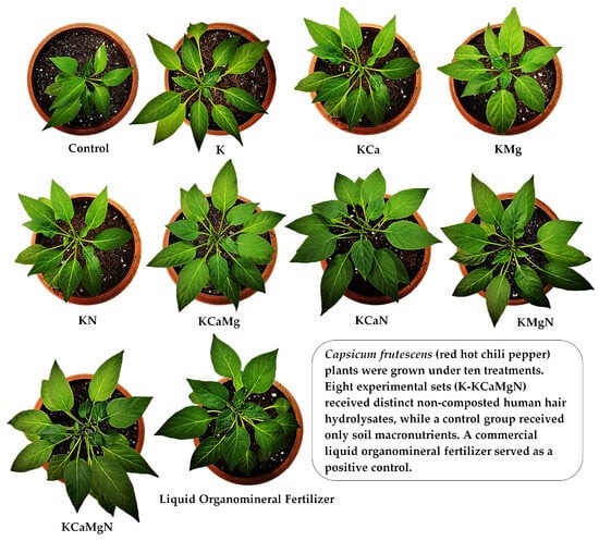 This greenhouse study aimed to investigate the impact of various fertilizer treatments on the growth parameters of the red-hot chili pepper plant (Capsicum frutescens). The study employed a systematic experimental design to evaluate the effects of three distinct treatments: (i) eight non-composted human hair hydrolysates in alkaline media (KOH, KOH + Ca(OH)2, KOH + Mg(OH)2, KOH + NH4OH, KOH + Ca(OH)2 + Mg(OH)2, KOH + Ca(OH)2 + NH4OH, KOH + Mg(OH)2 + NH4OH, and KOH + Ca(OH)2 + Mg(OH)2 + NH4OH), (ii) commercially available liquid organomineral fertilizer, and (iii) a control group. This design enables a methodical investigation of the effects of different fertilizer treatments (i.e., independent variables) on plant growth parameters (i.e., dependent variable) while minimizing the influence of other factors.