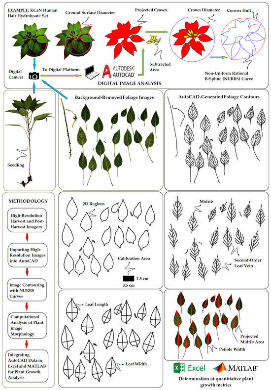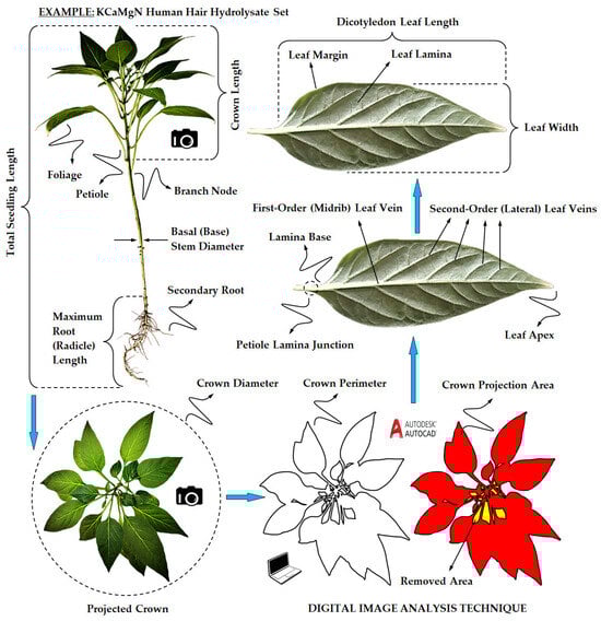 The digital image analysis methods described above were applied in greenhouse trials to quantitatively assess over 35 distinct effects of liquid non-composted human hair fertilizer on hot pepper plant growth. In addition, average color readings from five random points on leaf photographs were compared for plants grown in soil fertilized with various human hair hydrolysates. These comparisons were conducted under the same conditions and focused on chlorophyll green color, using the RGB color model (74, 255, 0, RGB percentage: 29%, 100%, 0%, and hexadecimal color code: #4AFF00). Figure 2 illustrates how digital image analysis is used to evaluate various plant growth parameters in both pre-harvested and harvested specimens.