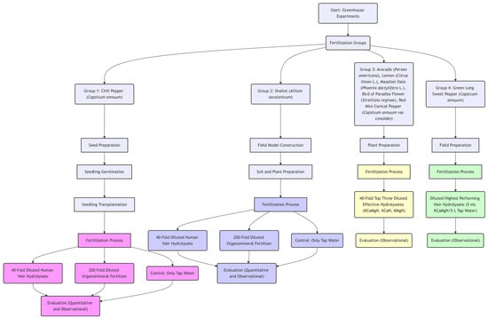 The greenhouse trials, conducted from 24 May 2023 to 22 April 2024 (approximately 335 days), encompassed four distinct application groups, aiming to promote sustainable agricultural practices. The first two groups were subjected to both observational and quantitative assessments, while the latter two groups served solely observational purposes. This agricultural research focused on the effects of human hair hydrolysates (i.e., diluted liquid fertilizers) on the growth of plants in different stages: (1) germination and cultivation of seedlings from seeds, (2) re-sprouting of well-developed plants after completion of their growth cycle, (3) growth of mature and healthy plants, and (4) development of garden plants within a pilot scale system.