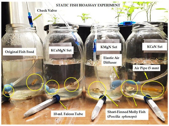 A controlled bioassay experiment was conducted using four identical glass jars, each with a 5 L active capacity. Prior to the experiment, the jars underwent rigorous cleaning and sanitation using hot water. To ensure experimental rigor, equal numbers of short-finned mollies, encompassing sub-variants such as the Golden Molly, Creamsicle Molly, and Dalmatian Molly, were randomly assigned to each jar. The fish were introduced to the jars along with their respective aquarium water to maintain their original environment. An aquarium air pump (Sera® Precision 550 R Plus, Seramoni Pet and Aquatic Products Industry and Trade Limited Company, Golbasi, Ankara, Turkey, flow rate = 9.17 L/min, power = 8 W) with four outlets was employed to provide a consistent oxygen supply for the fish. Elastic air diffusers with a diameter of 5 mm were attached to the ends of the air pipes that were linked to the pump using plastic clamps in order to promote even air distribution. In addition, 50 mm-long hard plastic check valves were fitted on each output pipe to keep water from getting into the air motor in the case of an air flow disruption or power outage. Air flow was maintained at a low level to minimize disturbance to the fish during the experiment. To ensure optimal feeding conditions, air flow was temporarily ceased during feeding intervals and then reconnected.