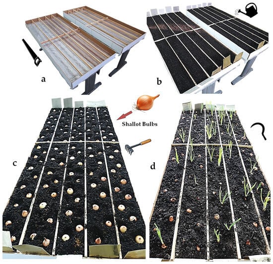 A controlled laboratory-based field model for evaluating human hair hydrolysate effects on shallot growth: (a) model construction (10 July 2023), (b) soil preparation and initial liquid fertilization (13 July 2023), (c) planting of shallot bulbs (13 July 2023) and (d) development of green shoots (5 September 2023) and subsequent harvest.