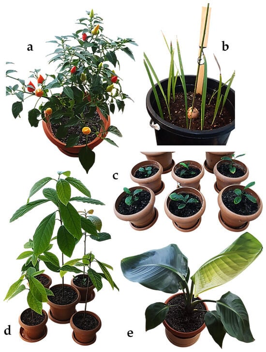 Growth observation of five temperate and tropical climate plant species under controlled environment: (a) Capsicum annuum var. conoides (22 April 2024), (b) Phoenix dactylifera L. (5 September 2023), (c) Citrus limon L. (16 October 2023), (d) Persea americana (22 May 2023) (e) Strelitzia reginae (14 August 2023).