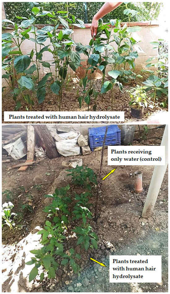 Concurrent observations in a pilot-scale garden environment, focused on the most effective formulation (KCaMgN, derived from the initial two groups), were conducted on long sweet green pepper (Capsicum annuum) for 48 days, applying the formulation every 3 days. In the pilot-scale garden, plants treated with human hair hydrolysate exhibited noticeably enhanced growth compared to a control group maintained under identical soil conditions and watered solely with tap water (Figure 9).