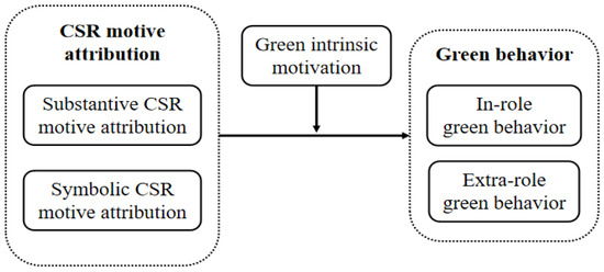 Green intrinsic motivation refers to a state in which people are driven by love and passion when participating in environmental causes rather than external rewards or benefits [21]. Green intrinsic motivation is an important motivation for personal environmentally friendly behavior as it focuses their attention on the environment and makes people attached to their environmentally friendly work [7,55]. People who have green intrinsic motivation will feel excited and satisfied when participating in environmental work [56]. According to attribution theory, an individual’s attitude and behavior are determined by both personal characteristics and environmental factors [20]. Personal characteristics are internal factors that include a person’s ability and motivation, while environmental factors are external factors that refer to organizational support, work environment, or luck. In our research, green intrinsic motivation is an important internal factor and CSR motive attributions can be regarded as external factors for employees to implement green behavior.