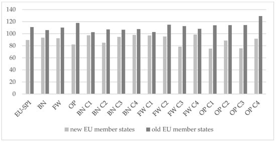 Comparison of average EU-SPI 2.0 (national) scores, its dimensions and components between new and old EU member states, 2024 edition. Source: authors based on [59].