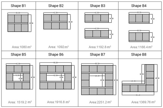 The initial focus of our study centers on a set of plan shapes based on different combinations of a 12 × 14 square meter modular unit (shapes B1 to B8). This set introduces variations with and without courtyards, coupled with three distinct heights of 3, 6, and 12 m representing 1 story (B1 to B8), 2 stories (B1-2 to B8-2), and 4 stories (B1-4 to B8-4), respectively.