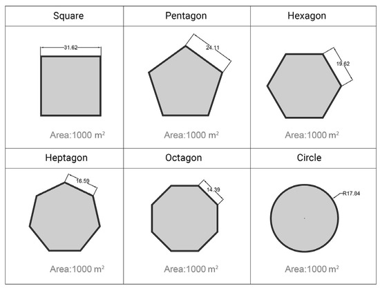 The second set of buildings shown in Figure 2 focuses on five polygonal and one circle plan shapes, all sharing the same GFA of 1000 m2. These are a set of fundamental geometric shapes, namely square, pentagon, hexagon, heptagon, octagon, and circle, that explore the mere impact of plan shape on environmental impacts.