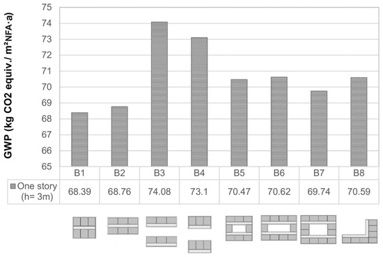The observed range for GWP, spanning from 42.14 to 74.08 kgCO2 equiv./m2NFA·a (net floor area) for the first set of shapes, highlights the considerable potential for reducing CO2 emissions by optimizing building shapes. Starting with the one-story building shapes, Figure 3 shows the GWP for shapes B1 to B8. The shapes B1 through B4 are designed to incorporate an identical number of 12 × 14 modules, totaling six modules each. The major difference between these four models is their compactness, measured as their form factor. Shapes B3 and B4 have form factors equal to 2.67 and 2.64. Shapes B1 and B2, on the other hand, exhibit lower values of 2.46 and 2.47, indicating smaller outer surface areas compared to the previous two shapes. This reduction in the outer surface area results in a decreased heat demand, which, by reducing the consumption of energy resources, leads to a lower GWP. This means that over 5 kg of CO2 equivalent per square meter per year can be saved through taking a more efficient design decision. This is a total saving of 13.91 tons CO2 equiv./a by selecting shape B1 over shape B3.
