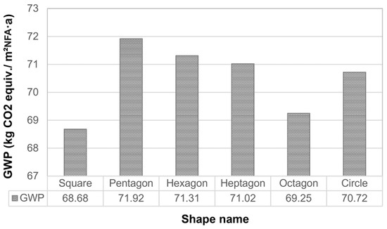 Figure 5 presents the GWP values for the second set of building shapes. The range varies between the lowest amount of 68.68 kgCO2 equiv./m2NFA·a for the square and the highest amount of 71.92 kgCO2 equiv./m2NFA·a for the pentagon. The lowest GWP value of the square can be attributed to the lowest window areas in the building surface (WFR of 0.09), which is responsible for the lowest exchange of heat in the form of gains and losses compared to other shapes, and therefore leads to a lower total energy demand of the building. The pentagon, hexagon, heptagon, and circle having almost similar WFRs of 0.19, 0.18, 0.17, and 0.17 show lower differences in terms of their GWP values. Under the assumptions of this study, selecting a square plan with windows only on the north and south sides, over a pentagonal plan shape, can result in a CO2 equiv. savings of 3.1 tons per year.