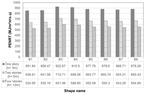 The PENRT (MJ/m2NFA·a) of different building shapes with three different heights.